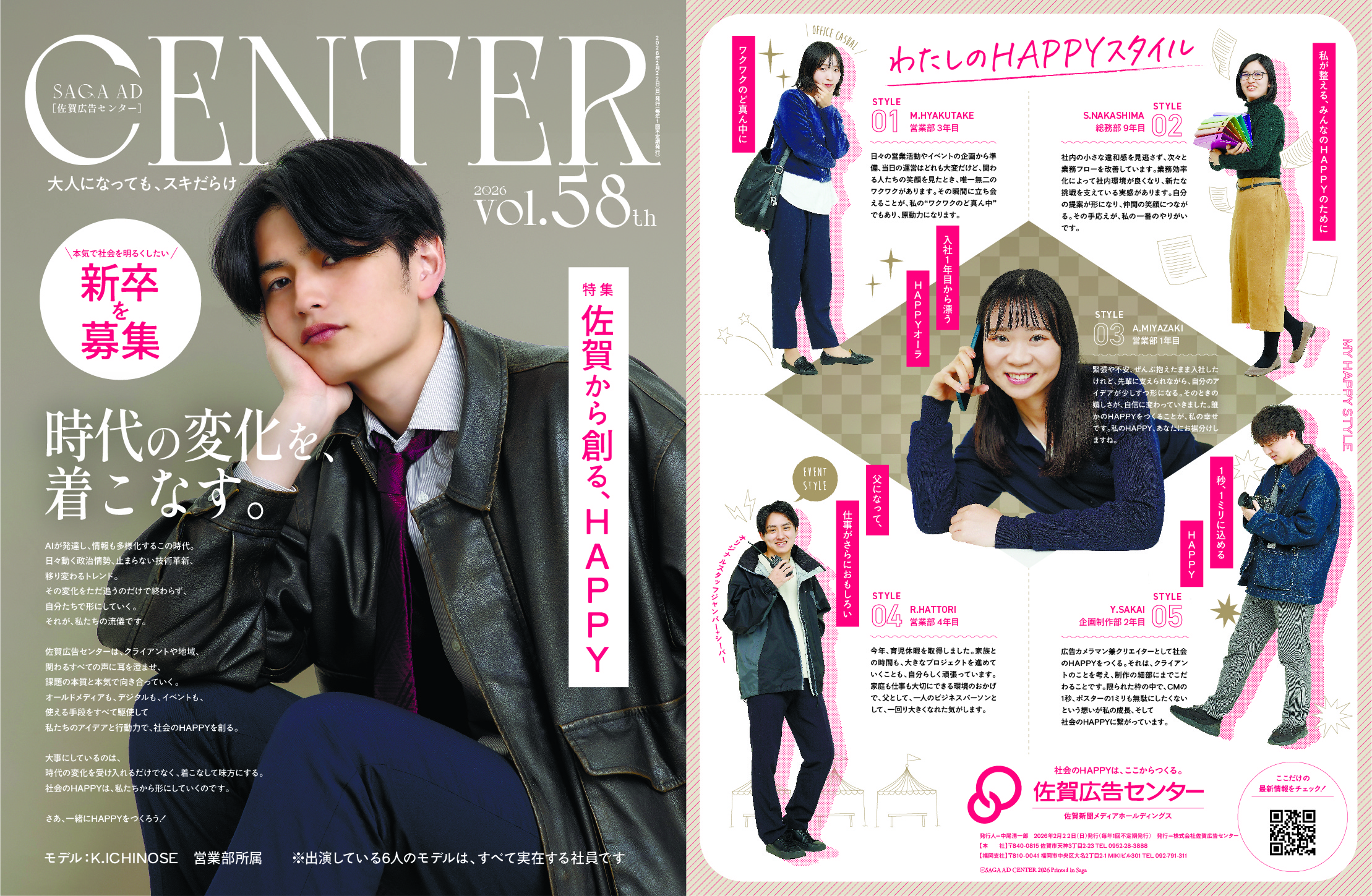 佐賀広告センターが発行する新たな雑誌『CENTER』が発売! …と言いたいところですが リクルート向けの新聞広告全30段が2月22日(日)佐賀新聞に掲載されました! モデルは事務所に所属してるんですか?いいえ、全員弊社所属の社員です! 着こなしてますね~! 就活生の皆さん、時代の変化を着こなし続ける佐賀広告センターで 一緒に社会のHAPPYをつくりませんか?